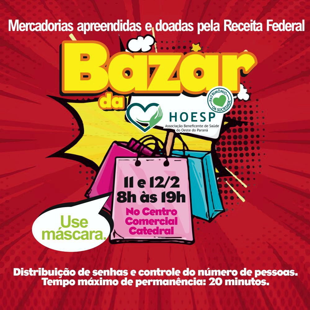 Nos dias 11 e 12 de fevereiro acontecerá o Bazar da HOESP/Hospital Bom Jesus, onde será possível encontrar mercadorias que foram apreendidas e doadas pela Receita Federal e todo o valor arrecadado será destinado ao Hospital, que atende os 18 municípios da 20ª Regional de Saúde.