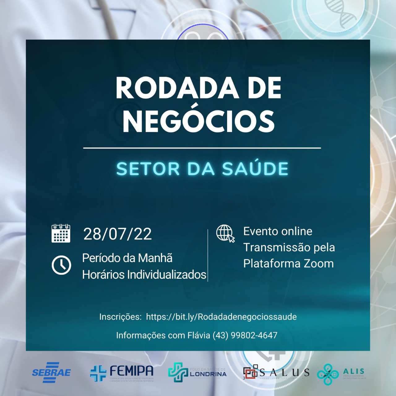 No dia 28 de julho, na parte da manhã, acontece de forma virtual a Rodada de Negócios do Setor de Saúde, organizado pela Femipa, Sebrae, Polo de Saúde de Londrina, Salus e Arranjo Londrinense das Indústrias de Saúde (Alis). O objetivo é criar oportunidades de negócios entre os hospitais, que são empresas compradoras, e empresas vendedoras de produtos e serviços para o setor da saúde. As inscrições são gratuitas e estão disponíveis até o dia 18 de julho, mas as vagas são limitadas.