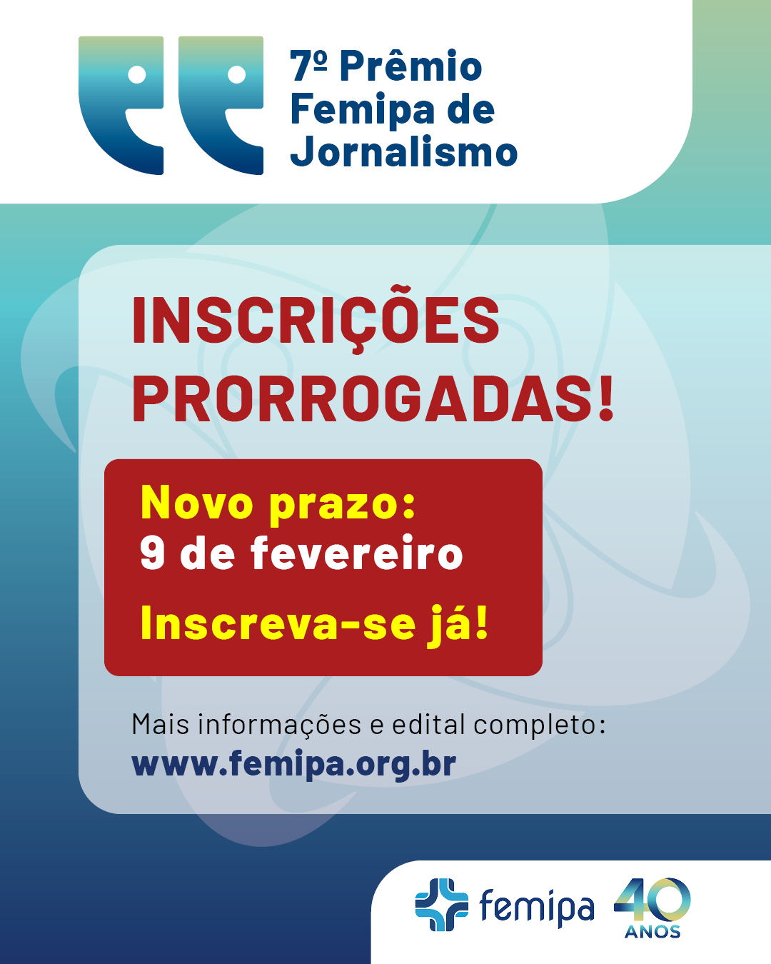 A Federação das Santas Casas de Misericórdia e Hospitais Beneficentes do Estado do Paraná (Femipa) prorrogou as inscrições do 7o Prêmio Femipa de Jornalismo em Gestão da Saúde para o dia 09 de fevereiro.