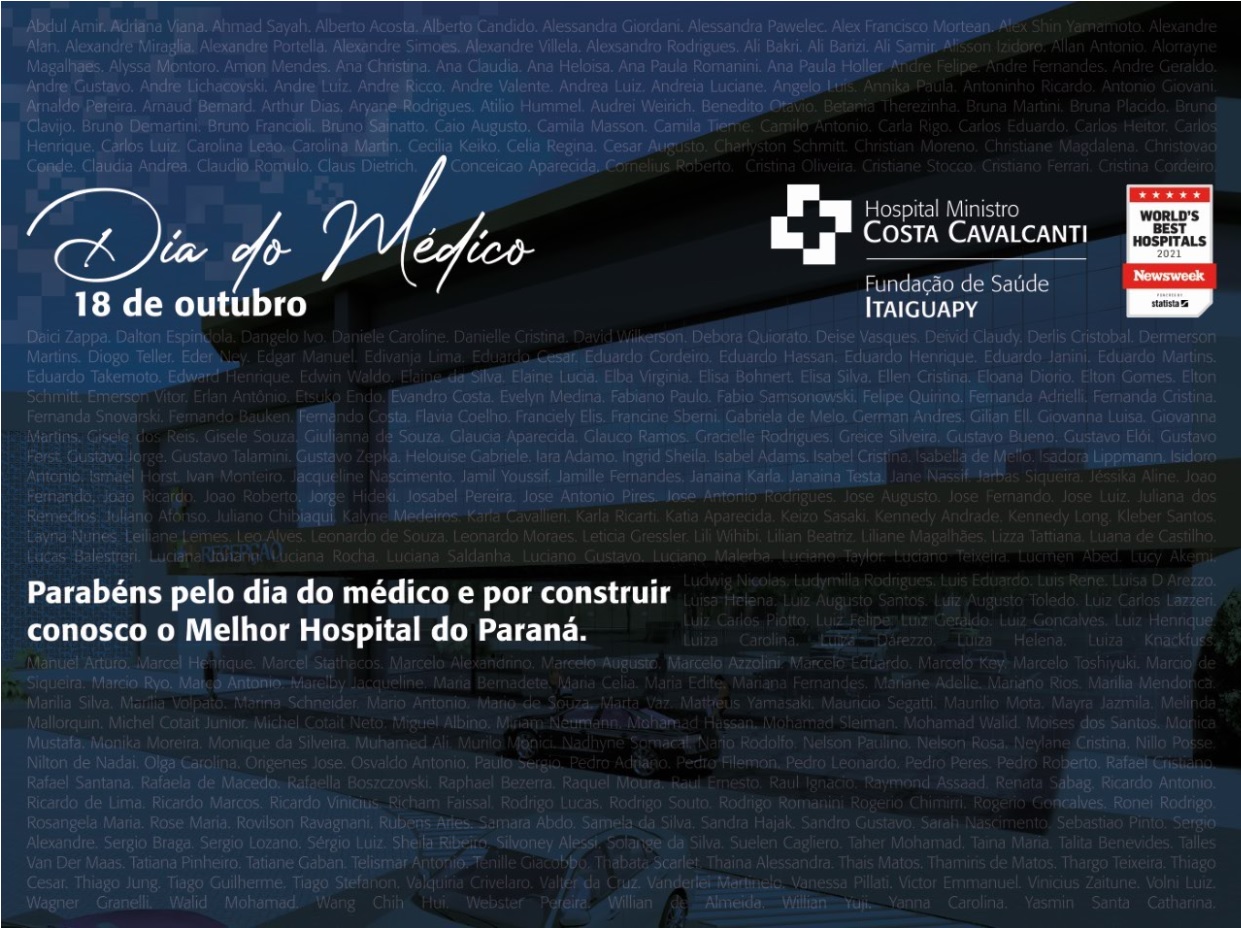 Levando em consideração o Plano de Expansão do HMCC, a nova unidade de atendimento Day Medical Center e outras importantes ações, os diretores do Costa Cavalcanti dedicarão o dia para homenagear esses heróis da saúde, compartilhar o Planejamento Estratégico, oferecer um diferenciado coquetel e entregar um kit personalizado com jalecos, crachás de identificação, caneca entre outros brindes. “Em nome da diretoria e de todos que fazem parte do HMCC, precisamos agradecer a todos os médicos do Corpo Clínico que nos ajudam a cumprir a nossa missão, sobretudo na batalha contra a covid-19. Se hoje somos reconhecidos como Melhor Hospital do Estado do Paraná (segundo a revista Newsweek), é porque eles também trabalham muito para isso”, finalizou Dr. Rodrigo.
