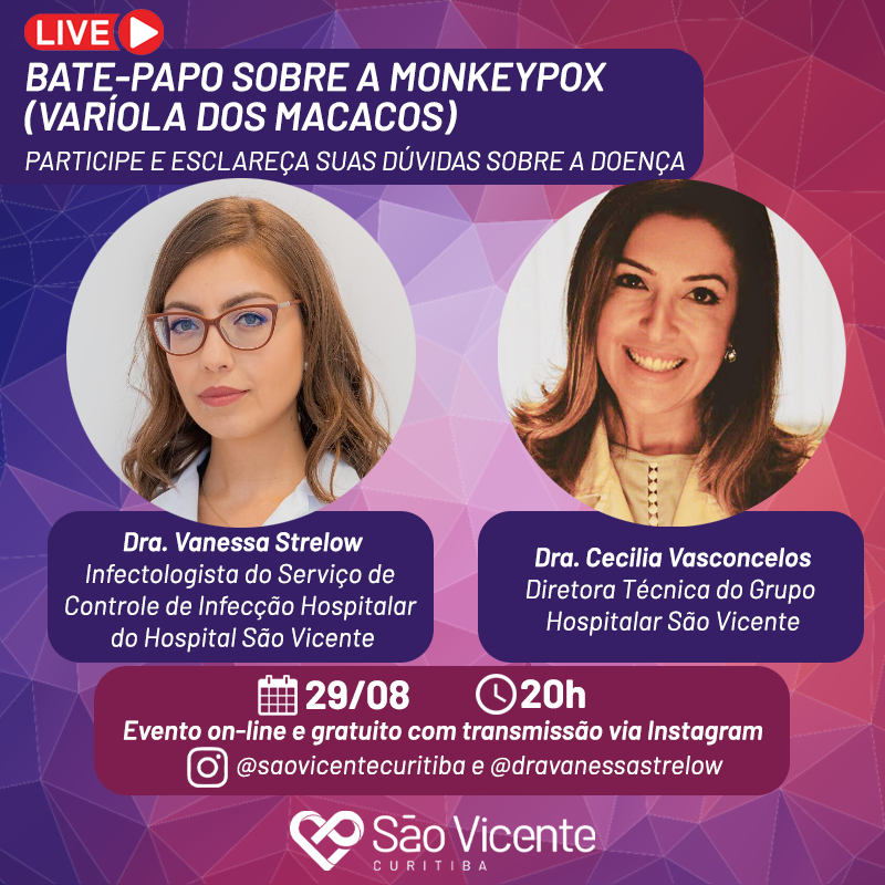 Para falar sobre o tema e orientar a população em geral, o Hospital São Vicente promove a live “Bate-papo sobre a Monkeypox/Varíola dos Macacos”, no dia 29 de agosto, às 20h, nos perfis do Instagram @saovicentecuritiba e @dravanessastrelow. O encontro será conduzido pelas médicas do Hospital São Vicente, a infectologista do Serviço de Controle de Infecção Hospitalar, Dra. Vanessa Strelow, e a diretora técnica, Dra. Cecília Vasconcelos.