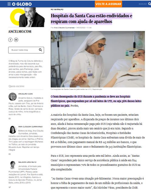 O colunista Ancelmo Gois, do jornal O Globo, destacou o alerta da CMB para a situação financeira do setor filantrópico de saúde e os riscos desse cenário para a continuidade da atuação dos hospitais, que representam 70% de todos os procedimentos gratuitos do SUS na alta complexidade e 56% dos leitos públicos de UTI no país.