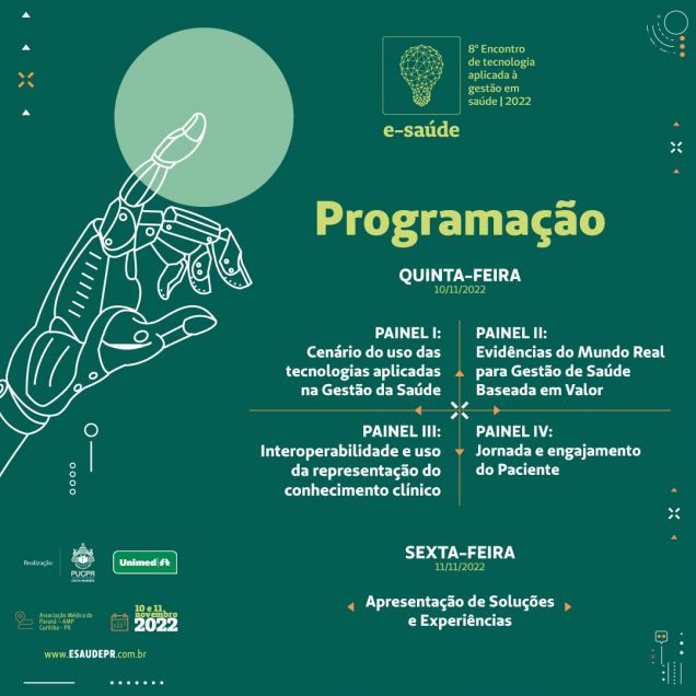 A oitava edição do E-saúde – Encontro de Tecnologia aplicada à gestão em saúde já tem data confirmada e vai acontecer entre os dias 10 e 11 de novembro, presencialmente na Associação Médica do Paraná (AMP), em Curitiba. O evento é promovido pela Unimed e pela Pontifícia Universidade Católica (PUC-PR), com apoio da Femipa, e as inscrições são gratuitas até o dia 04 de novembro, neste link. Com rica programação dividida nos dois dias de evento, os participantes poderão acompanhar painéis sobre tecnologia, gestão, interoperabilidade, jornada e engajamento do paciente, além de assistir aos cases e relatos de quem já emprega a tecnologia no setor de saúde. O público-alvo são gestores, dirigentes, técnicos, professores e alunos de instituições de ensino e hospitalares e de operadoras de planos de saúde, oportunizando, ainda, um ambiente de networking aos participantes.