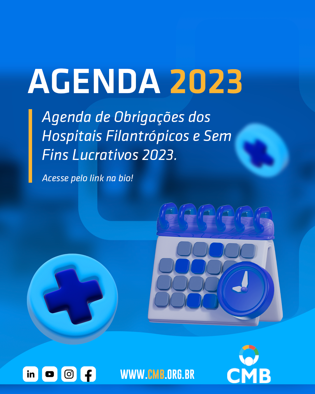 A Confederação das Santas Casas de Misericórdia, Hospitais e Entidades Filantrópicas (CMB) disponibiliza a Agenda de Obrigações para 2023. Dentre os tópicos abordados no documento, estão detalhamentos importantes, como os procedimentos obrigatórios, fundamentos legais e prazos, a serem observados pelos hospitais sem fins lucrativos.