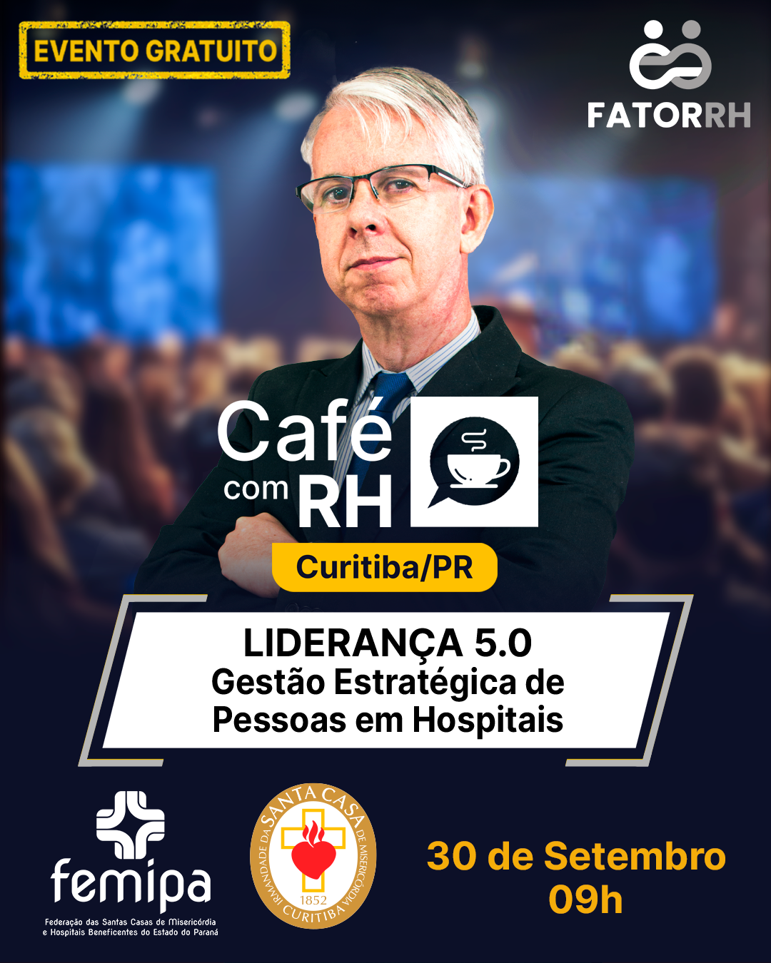 A Femipa, em parceria com a Irmandade da Santa Casa de Misericórdia de Curitiba e a Fator RH, convida líderes e gestores da área da saúde para o “Café com RH” em Curitiba. O evento é gratuito e acontece no dia 30 de setembro, às 9h, com um Workshop do renomado Dr. Fabrizio Rosso, que abordará o tema “Liderança 5.0 e Gestão Estratégica de Pessoas em Hospitais”.