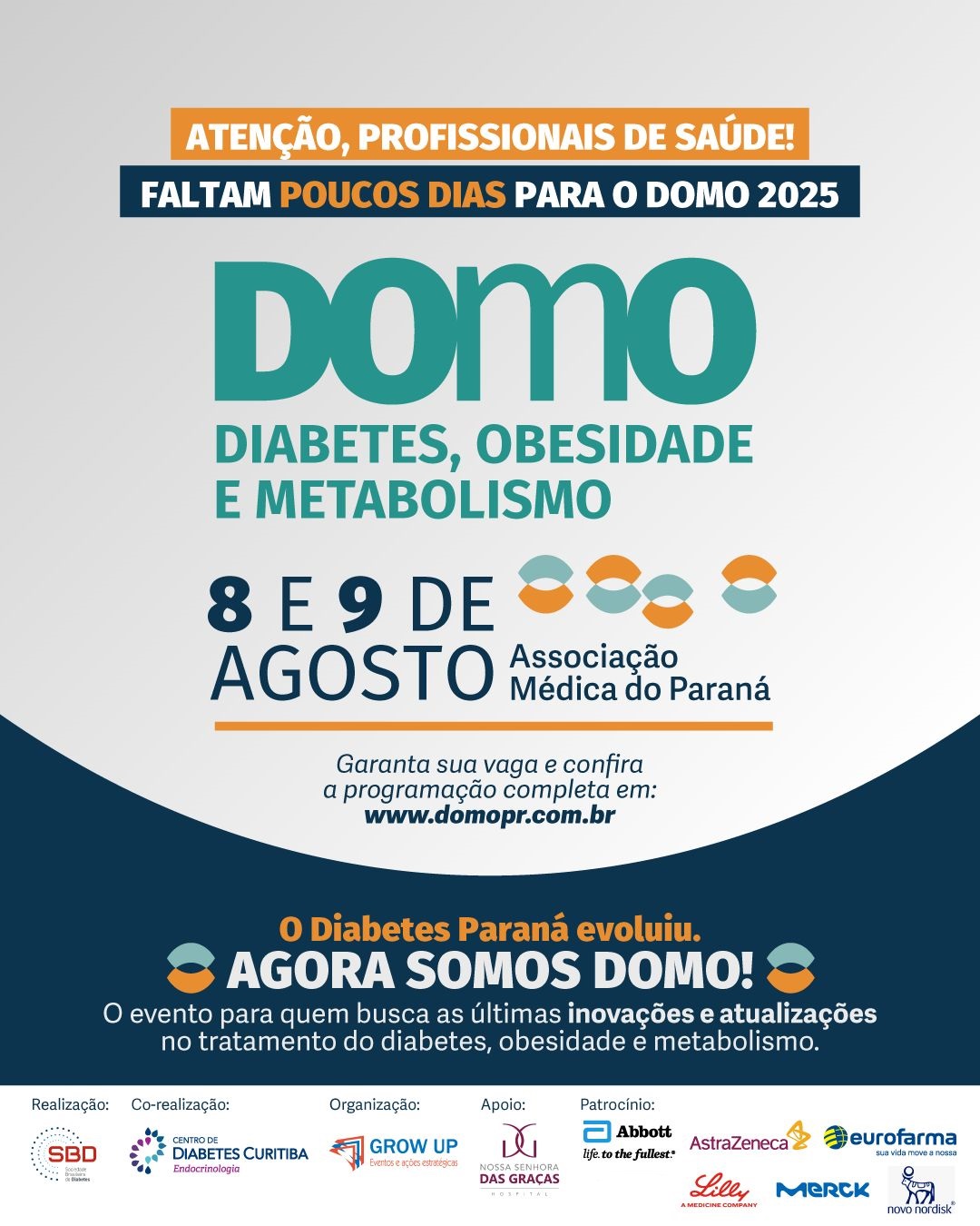 Voltado a endocrinologistas, clínicos, cardiologistas, nutricionistas, geriatras e demais profissionais da saúde, o DOMO 2025 será realizado na Associação Médica do Paraná (AMP), em Curitiba, e reunirá especialistas de destaque nacional em um encontro dedicado à atualização prática e multiprofissional nas áreas que mais avançam dentro da endocrinologia clínica.