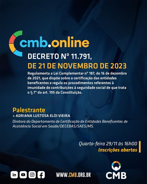 Na próxima quarta-feira, 29 de novembro, às 16h, acontece o CMB Online. Com as inscrições abertas, o tema será o decreto que regulamenta a Lei do Cebas – DECRETO Nº 11.791, DE 21 DE NOVEMBRO DE 2023. A palestrante será Adriana Lustosa Eloi Vieira, diretora do Departamento de Certificação de Entidades Beneficentes de Assistência Social em Saúde/DECEBAS/SAES/MS.