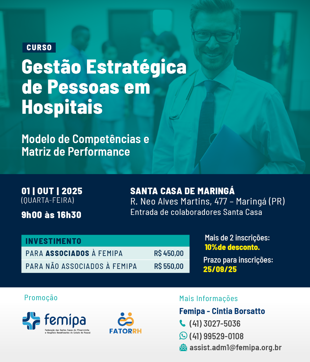 A FEMIPA (Federação das Santas Casas e Hospitais Beneficentes do Estado do Paraná) e a Fator RH se unem para promover um curso essencial para gestores e profissionais da área da saúde: “Gestão Estratégica de Pessoas em Hospitais”. O evento acontecerá no dia 1º de outubro de 2025, na Santa Casa de Maringá, das 9h às 16h30.