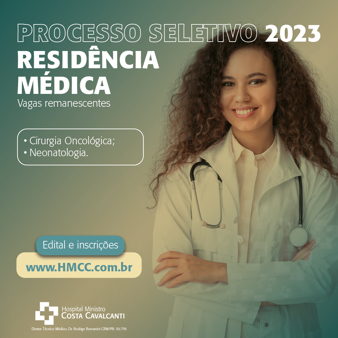 O Hospital Ministro Costa Cavalcanti (HMCC) publicou, nesta terça-feira, dia 03, o edital de vagas remanescentes para Residência Médica nos programas de Cirurgia Oncológica e Neonatologia. As inscrições abrem no dia 17/01. Todas as informações estão disponíveis em www.HMCC.com.br. Ao todo, são duas vagas para o programa de Cirurgia Oncológica, com pré-requisito em Cirurgia Geral, e uma para Neonatologia, com pré-requisito em Pediatria. As provas acontecerão no dia 15 de fevereiro, com a 1ª fase pela manhã e a 2ª à tarde.