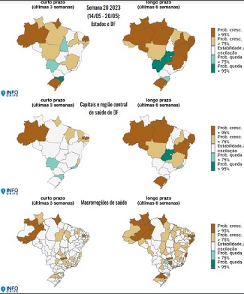No cenário epidemiológico geral do país, há sinal moderado de crescimento de SRAG na tendência de longo prazo (últimas seis semanas) e de estabilidade na de curto prazo (últimas três semanas). Das 27 unidades federativas do Brasil, 19 apresentam tendência de crescimento.