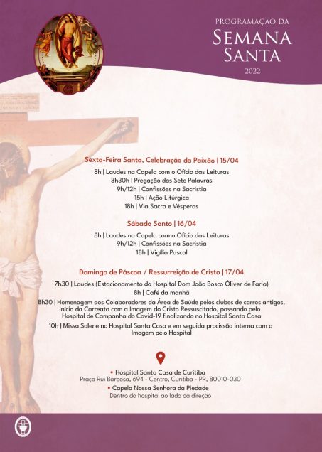 Todo o evento no Domingo de Páscoa faz parte da extensa programação da Semana Santa 2022 que a Irmandade programou para este ano através do seu serviço de Pastoral da Saúde. Para o provedor da ISCMC, Dom Diamantino Prata de Carvalho, a participação ativa da comunidade no evento é essencial para promovermos o espírito de humanização e de celebração da vida. “A Irmandade realiza um papel importante de evangelização e humanização com a Semana Santa, e convidamos a sociedade para rezarem e comemorem junto conosco em prol não somente dos enfermos, mas daqueles que também exercem seu papel de cuidadores, os profissionais da saúde”, fala o provedor.