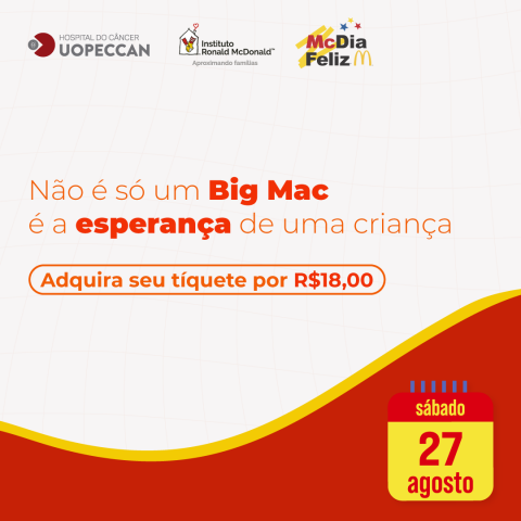 O Hospital do Câncer Uopeccan iniciou a venda antecipada dos tickets da 34ª edição do McDia Feliz, uma das maiores campanhas de mobilização em prol da saúde e educação de crianças e jovens do Brasil. Em 2022, a ação vai acontecer no dia 27 de agosto (sábado), com a venda de tickets antecipados do sanduiche Big Mac já disponíveis pelo e-commerce [ www.mcdiafeliz.org.br ] no valor de R$ 18,00; ou site https://www.mcdiafeliz.org.br/comprar/10/0/1/; ou para venda física com os voluntários das instituições.
