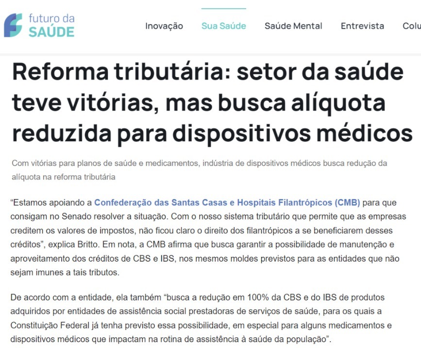 Reportagem do portal Futuro da Saúde, que tratou da reforma tributária no setor, trouxe o posicionamento da CMB sobre a regulamentação dos impostos para a área. Aprovado na Câmara, o texto segue agora para o Senado.  A expectativa é que a alíquota geral seja de 26,5%.