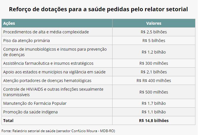O relatório setorial da área da Saúde para o Orçamento de 2023 (PLN 32/22) foi aprovado nesta terça-feira (6) pela Comissão Mista de Orçamento. O parecer do senador Confúcio Moura (MDB-RO) foi aprovado com um pedido de mais R$ 14,8 bilhões ao relator-geral, senador Marcelo Castro (MDB-PI). O recurso seria necessário para atender o piso constitucional mínimo da Saúde (R$ 149,9 bilhões) e para cobrir carências em várias ações como Serviço de Atendimento Móvel de Emergência (Samu), tratamento de câncer e programa Farmácia Popular.