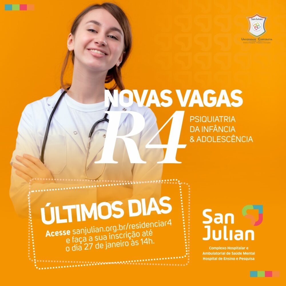 A Psiquiatria da Infância e Adolescência é uma das áreas mais desafiadoras e essenciais da medicina moderna. Pensando nisso, o Hospital San Julian, maior hospital de psiquiatria do Paraná e referência nacional em saúde mental, está oferecendo quatro vagas exclusivas para o programa de R4 em Psiquiatria da Infância e Adolescência. Na especialização, é possível ter acesso a uma formação completa, com suporte de uma equipe multidisciplinar, infraestrutura de pronta e uma vivência prática transformadora.