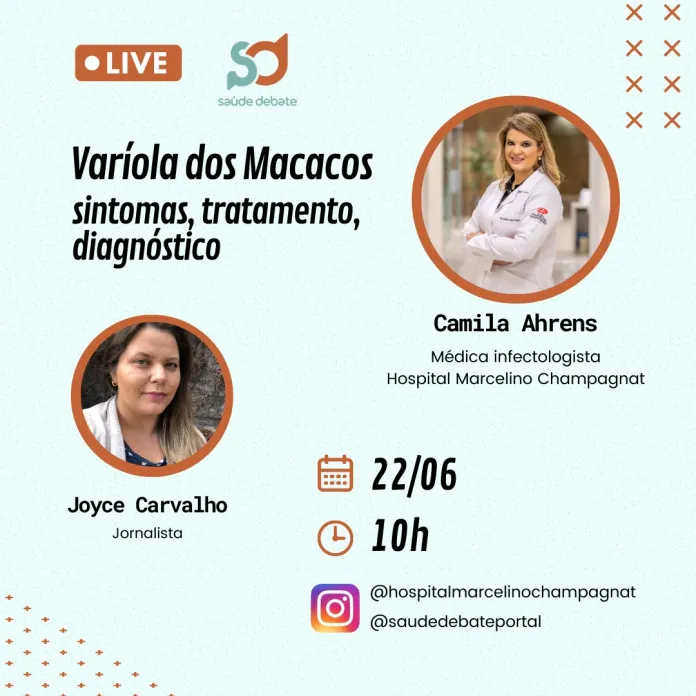 A jornalista Joyce Carvalho, editora do portal Saúde Debate, conversará com a médica infectologista Camila Ahrens, do corpo clínico do hospital, para tirar as dúvidas sobre a doença, prevenção à varíola dos macacos, monitoramento dos pacientes, tratamento e quais são os riscos de a doença avançar no Brasil. A médica também responderá se a varíola dos macacos tem cura.