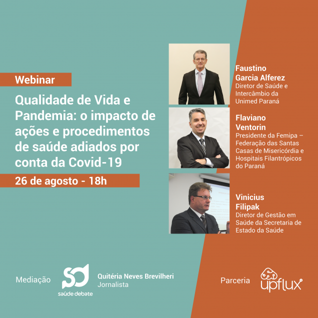 Com o objetivo de promover o debate sobre temas importantes da área da saúde, o Saúde Debate vai realizar seu primeiro webinar: Qualidade de Vida e Pandemia: o impacto de ações e procedimentos de saúde adiados por conta da Covid-19. O encontro acontecerá no dia 26 de agosto, às 18 horas, com transmissão pelo canal do Saúde Debate no YouTube. A iniciativa conta com parceria da Upflux.
