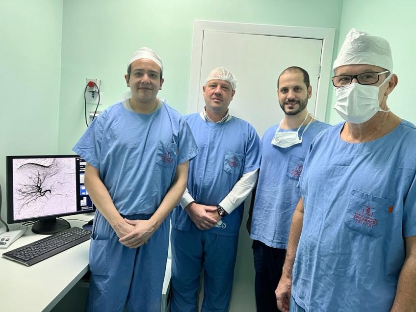 O segundo procedimento realizado no HNSG, que no Sul do País se torna pioneiro na técnica, foi realizado pelos médicos Dr. Christian Bark Liu, coordenador da área de radiologia intervencionista do Serviço de Hemodinâmica do HNSG e Dr João Vitor Bacarin, radiologista intervencionista; Dr. Eduardo Woellner, do Serviço de Medicina Nuclear (CERMEN), e contou com a coordenação do médico Felipe Nasser, do Hospital Albert Einstein