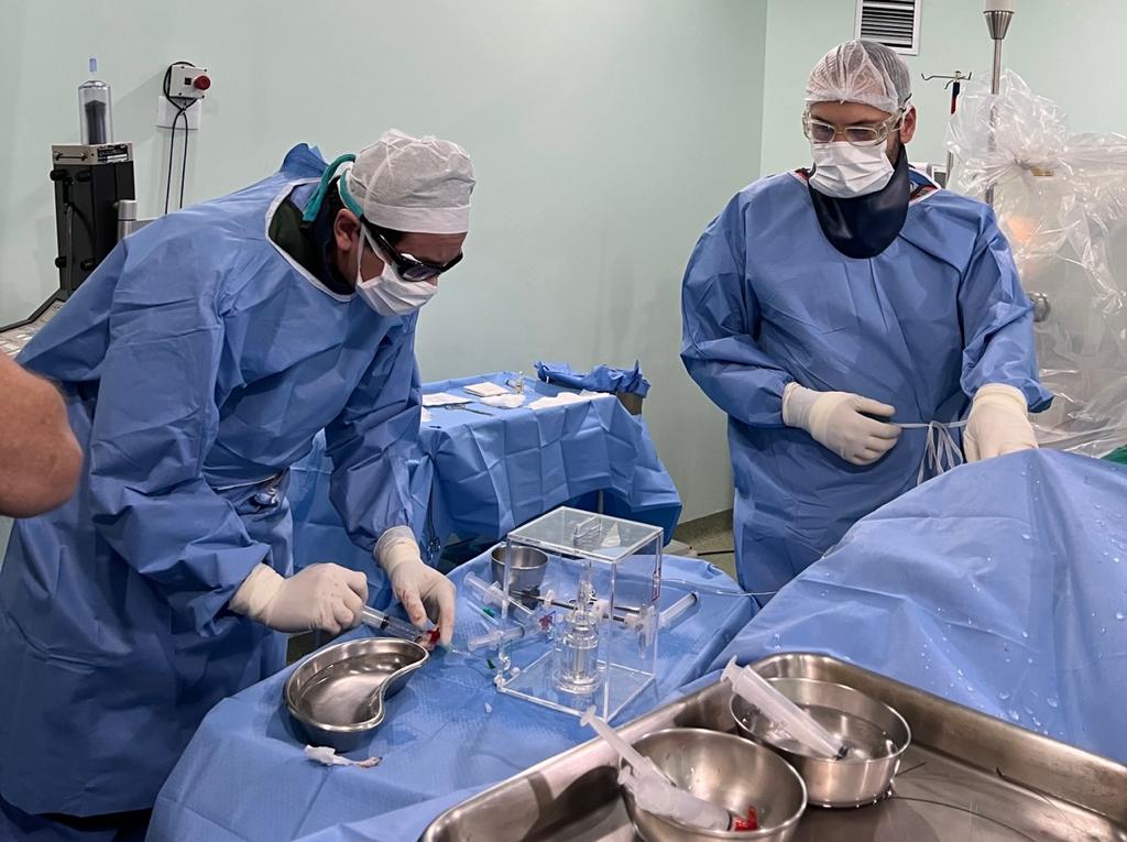 O segundo procedimento realizado no HNSG, que no Sul do País se torna pioneiro na técnica, foi realizado pelos médicos Dr. Christian Bark Liu, coordenador da área de radiologia intervencionista do Serviço de Hemodinâmica do HNSG e Dr João Vitor Bacarin, radiologista intervencionista; Dr. Eduardo Woellner, do Serviço de Medicina Nuclear (CERMEN), e contou com a coordenação do médico Felipe Nasser, do Hospital Albert Einstein